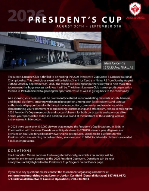 The Miners Lacrosse Club is proud to host the 2026 President’s Cup Senior B Lacrosse National Championship—one of the premier events in Canadian lacrosse. This high-energy, nationally recognized tournament will take place at the Silent Ice Centre in Nisku, Alberta, from August 30 to September 5, 2026.